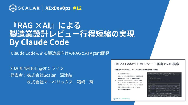 製造業における設計レビュー(Design Review)工程を短縮するための RAG基盤の構築を行いました。 マイクロRAGを構成し、ベクトル検索とキーワード検索を両立し、複数のRAGを連携してエージェントがデータを取得し、物理シュミレーションを実施するためのエージェントをどのように作っているのかをお話しします。